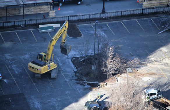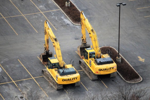 Disregard any talk you may have heard about One South Halsted taking its sweet time getting started. A week after the foundation permit was filed by the City of Chicago, the apartment tower from Fifield Companies and F&F Realty has emptied and cordoned off the parking lot, set up temporary sidewalks on Halsted and Madison Streets, and knocked down trees on the site. There are excavators on site, plus dump trucks, equipment trailers, even a cement mixer. And, as of 9:20 this morning, one of those excavators is tearing up the asphalt.