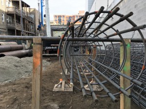 Stalworth sent over some photos showing just how tight the squeeze was. I looked, and couldn’t find the smallest morsel of sawdust under any of the electrical poles. That’s allowed them to stockpile caisson equipment and get to work in the tiny, enclosed lot.