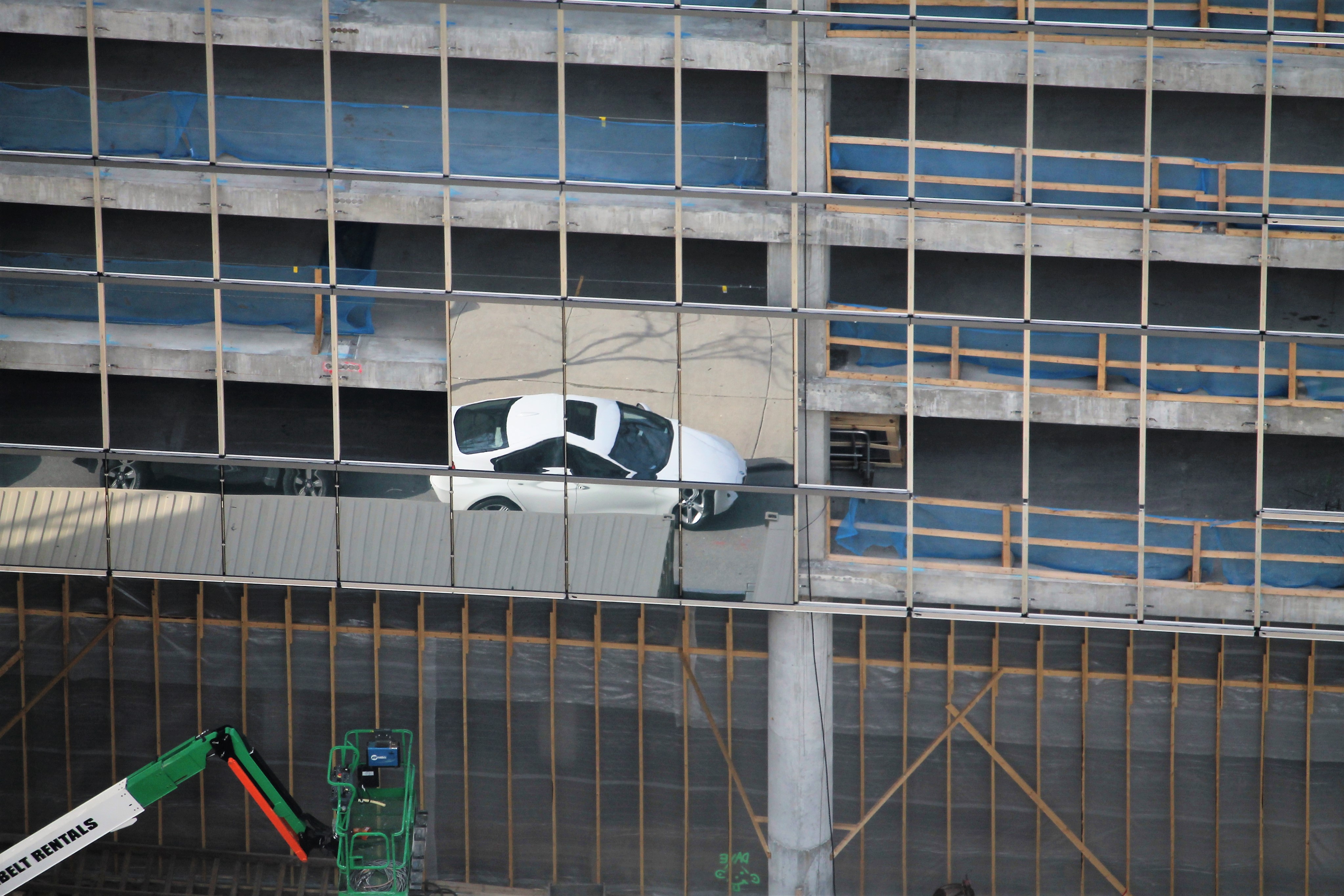 625 West Adams Published April 9, 2017 at 4093 × 2729 in 625 West Adams holds its first day of glass A car parked along Adams Street is reflected in the shiny new curtain wall at 625 West Adams.