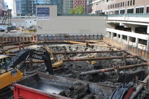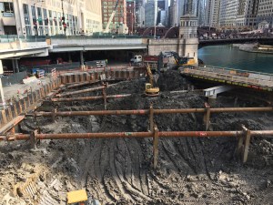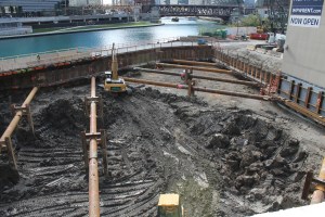 Wolf Point East was one of my first stops upon returning to Chicago. Mostly to see that trestle bridge in action, but also to see how much progress Walsh Construction has made on one of the city’s newest skyscrapers. No surprise that the bridge is being used to help with the deep excavation going on now. Truckload after truckload of dirt and mud and Chicago River muck is being hauled away, while diggers great and small eat away at the earth between the bracing.