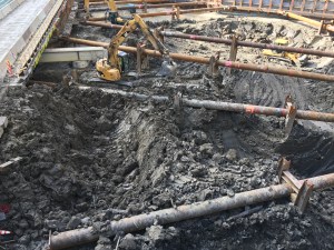 Excavation crews work atop the trestle bridge as digging continues at Wolf Point East.