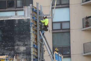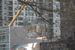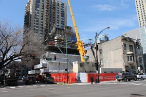 I normally assume a 13-story residential tower will require the use of a tower crane. Eight stories is where I picture an imaginary line when a crane decision has to be made. So I expected months ago to see a permit come through for a tower crane foundation at 56 West Huron in River North. I’m still waiting; Gilbane Building Company, however, is not. They’re making great progress with a humble, albeit pretty & yellow, rolling crane.