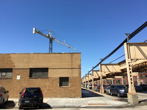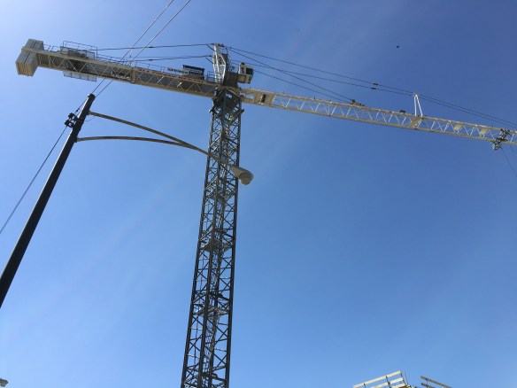 The core is springing up from the middle of the lot at Twelve01West, the new seven-story office building at 1201 West Lake Street from McCaffery Interests. Probably because we finally got a (somewhat) warm, sunny spring day, and because W.E. O’Neil has that glowing tower crane at their disposal.