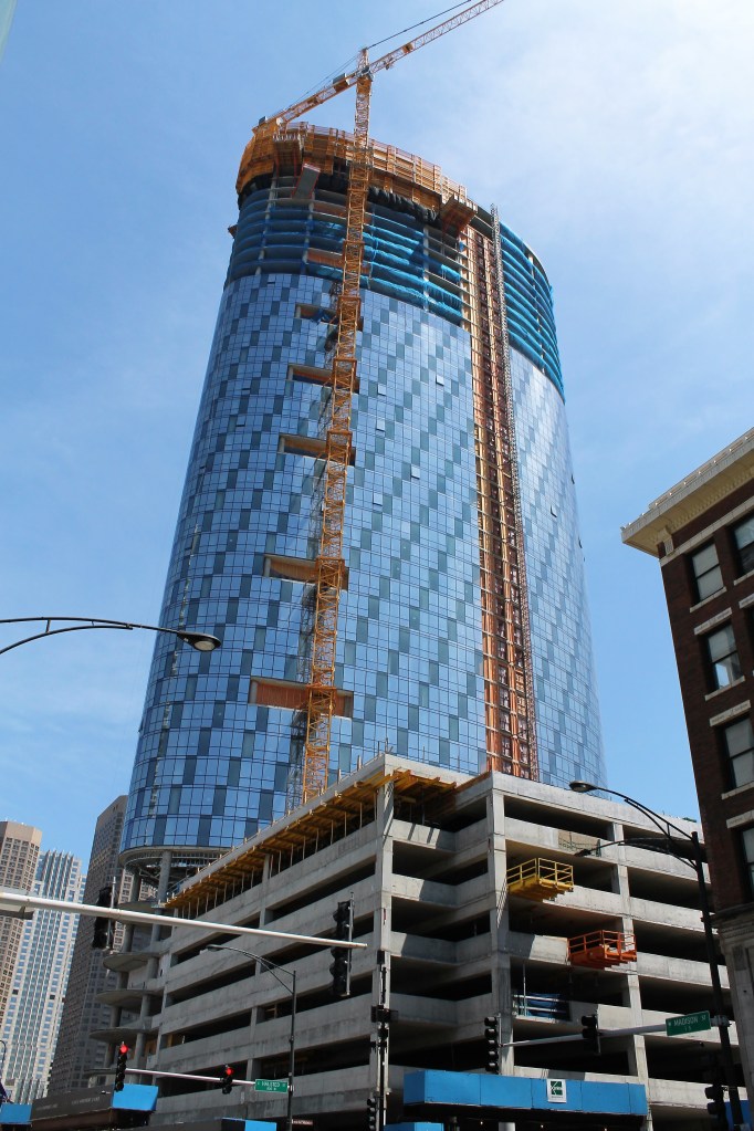 727 West Madison June 2018 15 Published June 4, 2018 at 2846 × 4272 in A topped-out 727 West Madison dresses up the parking podium
