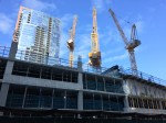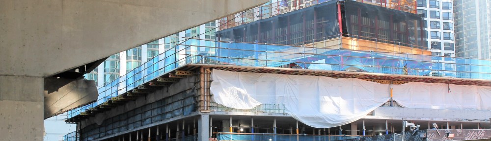 The last time Cirrus Condominiums and Cascade Apartments appeared on this blog, I pointed out the need to get as many photos as possible before construction rose above “theater level” from N. Harbor Drive. Well, here’s the thing about that. With construction looming so close to that elevated walkway, you can’t have construction nerds standing within an arm’s length of carpenters and iron workers, offering our advice on how work should be done. And so, the sidewalks have been (understandably) walled off to provide a safety buffer between pedestrians and professionals, limiting us tower crane enthusiasts to get shots where we can. Which is still pretty cool, tbh.