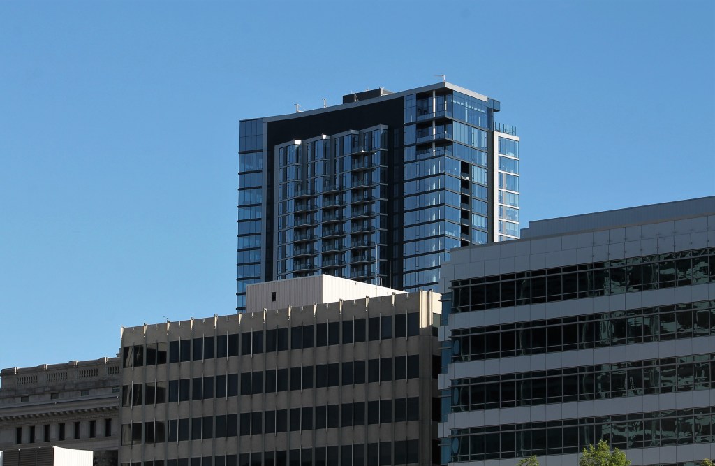 This is the third and final entry on this blog dedicated to 7SEVENTY7, a residential tower in Milwaukee that went from a hole in the ground on my first visit, to work-in-progress construction site on my second go ’round in 2017, to a finished apartment building when I walked by early in June 2021.