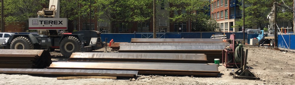 Caissons are done, but foundation work continues for Embry at 21 North May in the West Loop. A 270-degree tour around the site last week shows piles have been driven into the ground, and a bunch more sat at the ready for their turn in the soil. That’s the firm of McHugh & McHugh (Construction & Concrete) on the job out there, getting this 16-story, 58-unit condo building from Sulo Development ready to go vertical. And remember, they’ll be getting a shiny yellow Liebherr tower crane soon, too.