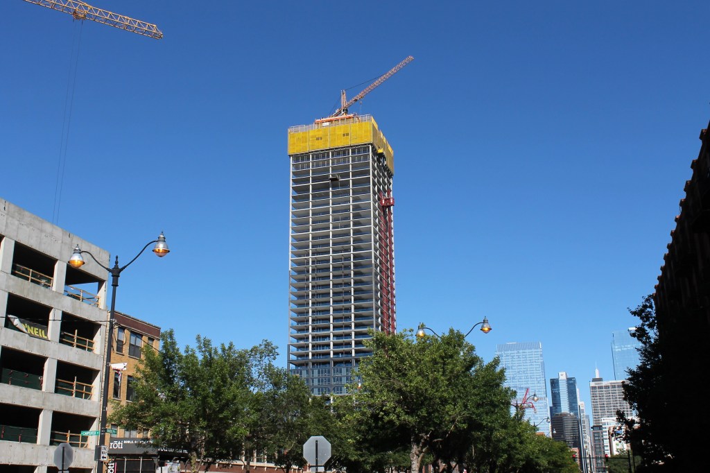 900 Randolph has been fun to watch. Nothing fancy, nothing out of the ordinary. But tall, sleek, and darn near topped out. The skip is numbered up to 34; there are at least six poured floors above the 34th floor. That puts it into the 40s. It’s a 43-story building I was told there would be no math, but even I know that only leaves a couple levels to go.