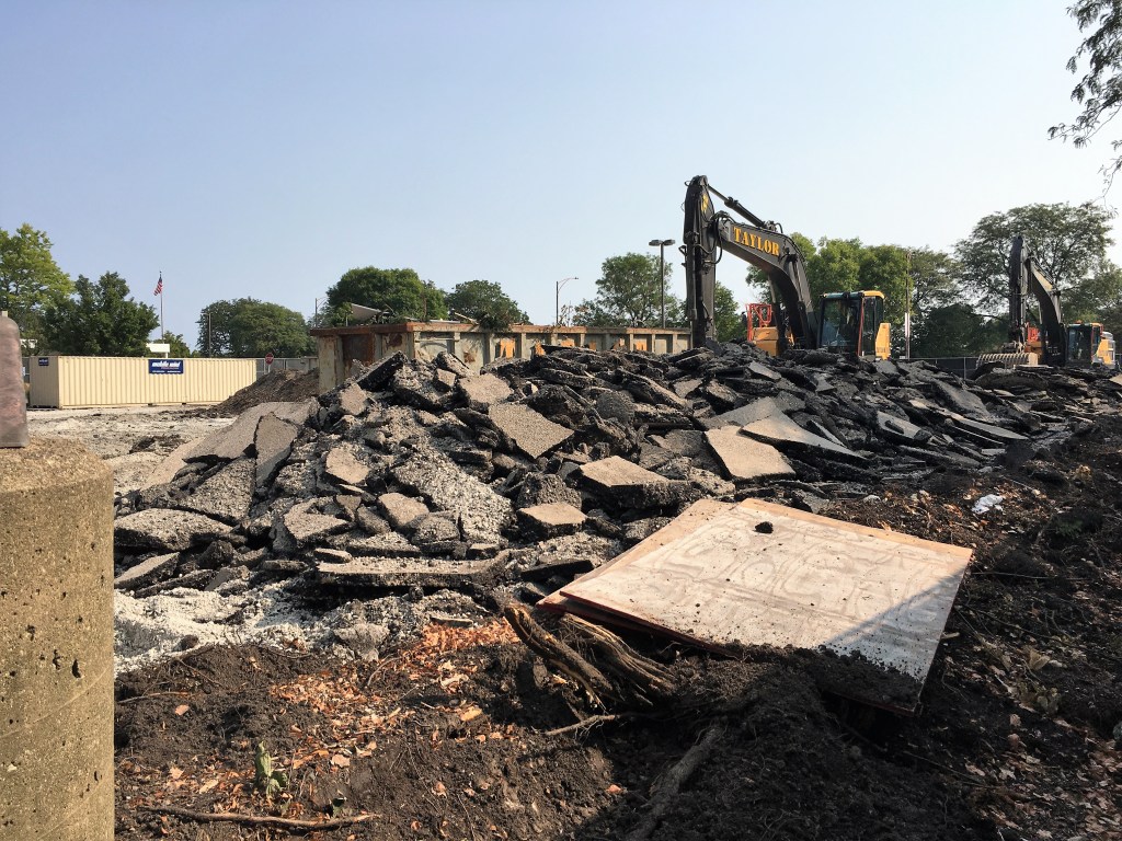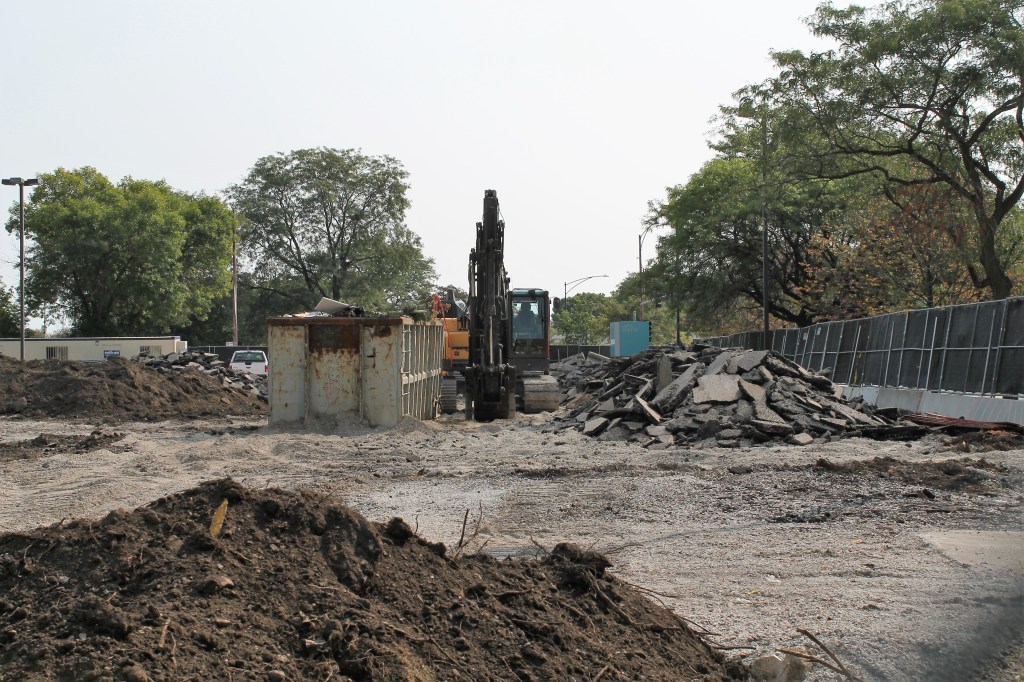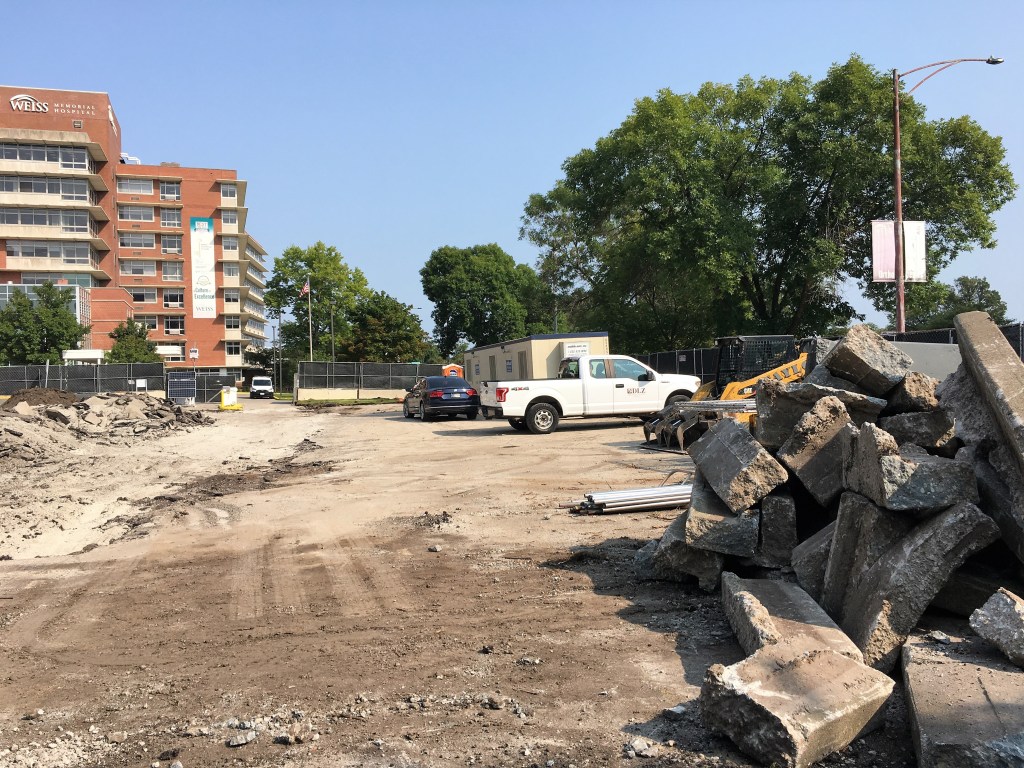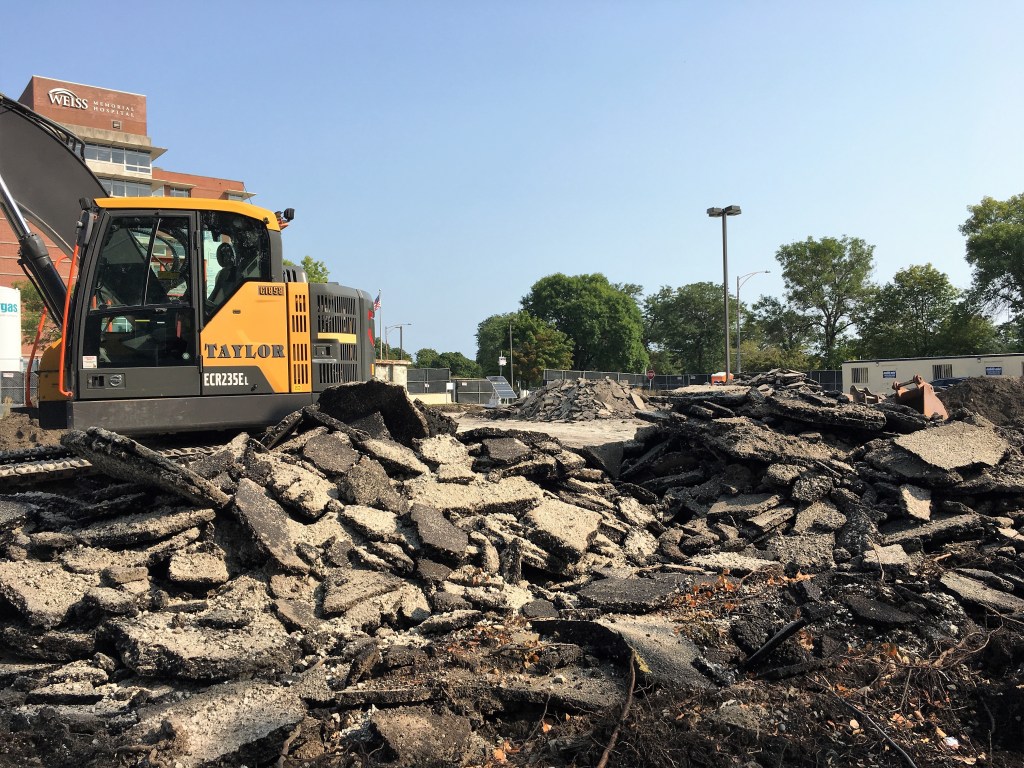 The Weiss Hospital parking lot at Marine Drive and Wilson Avenue is gone. Toast. Rubble. History. Ground prep is underway after the first permits were issued early this month by the city for a new 12-story, 303-unit residential development here. The foundation permit came through on the first of the month. And no waiting on a tower crane permit; that was issued September 7.