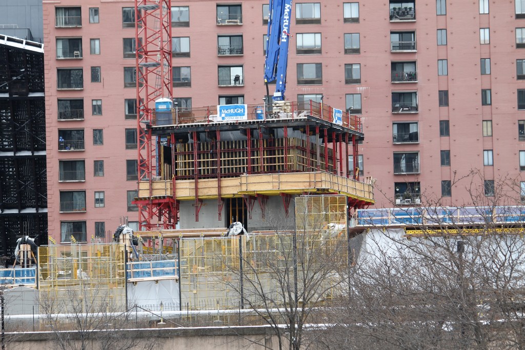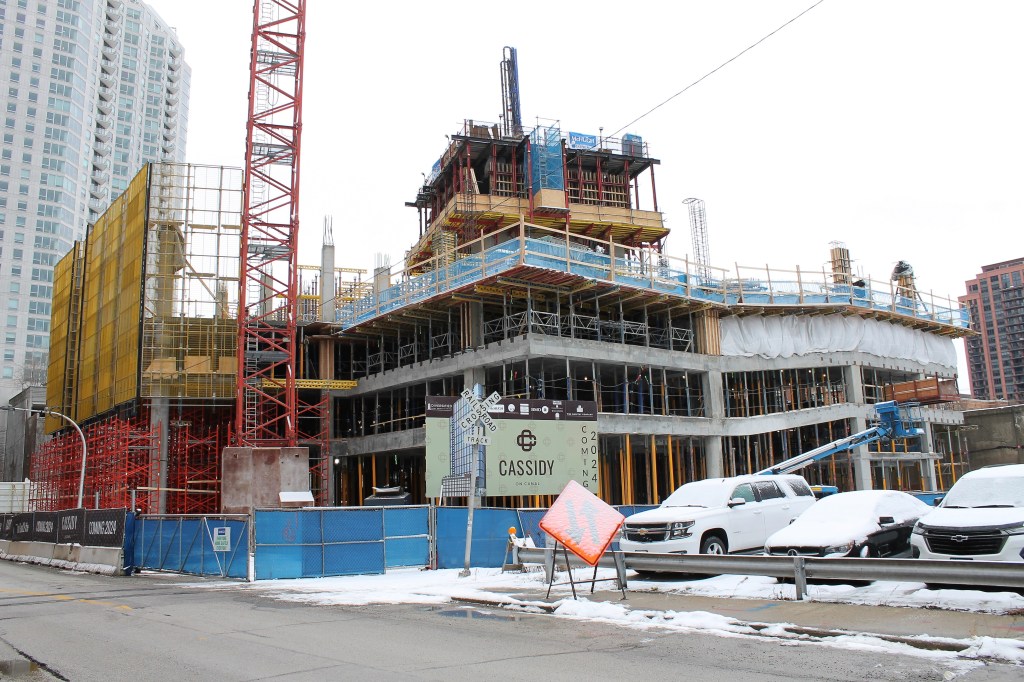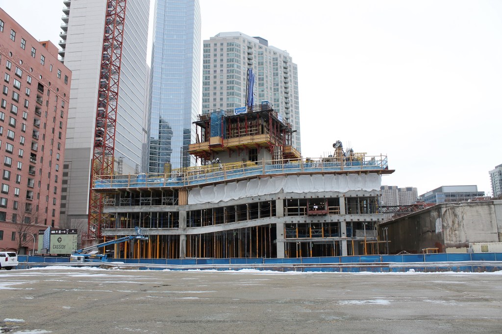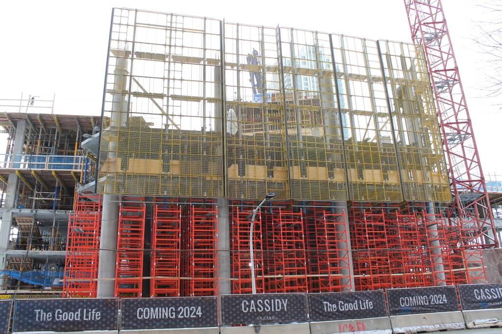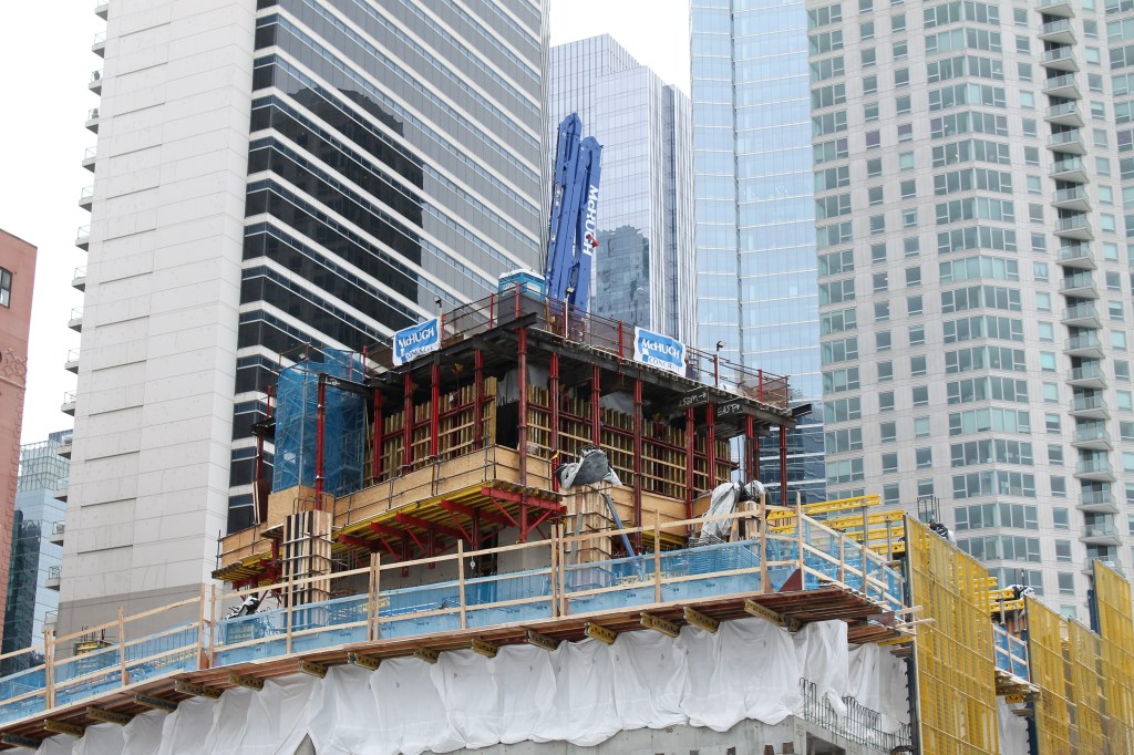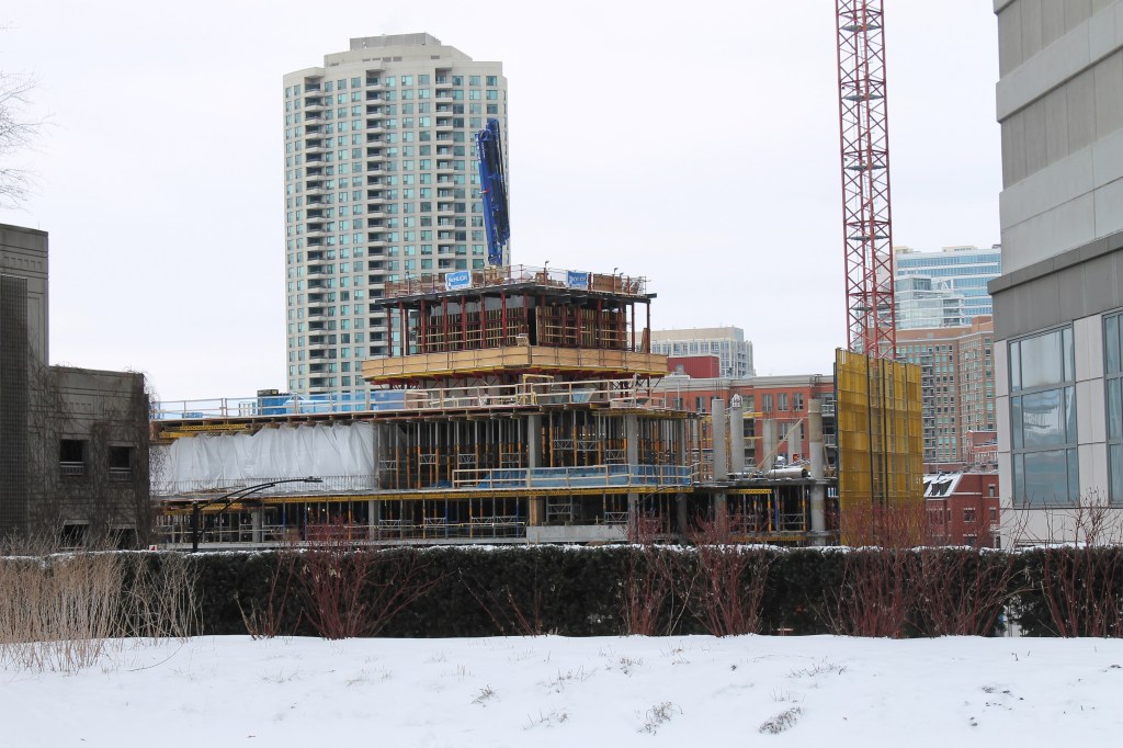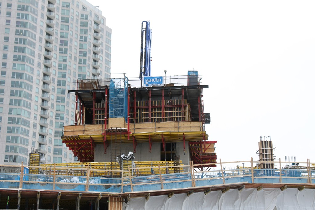 Now, McHugh & McHugh have reached the underside of the fifth floor. Have a look at their progress on a cold, cloudy January ’23 Sunday (I love having the Fulton House condo building as a backdrop):