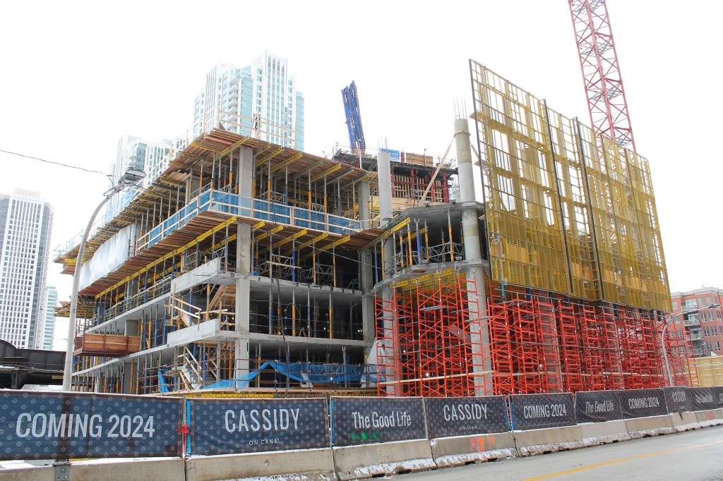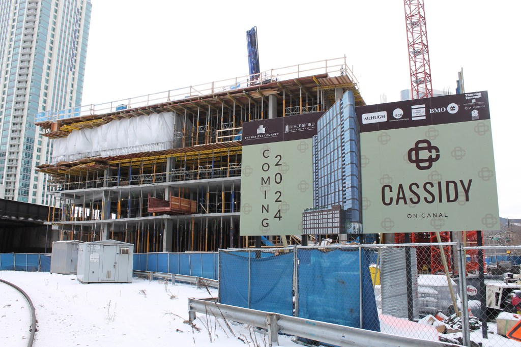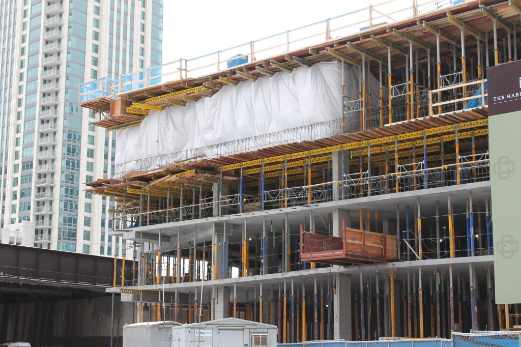 It’s pretty easy to remember when I was last at Cassidy on Canal; just scroll back a couple pages. In mid-September, caisson work had just begun on The Habitat Company’s 33-story, 343-unit, SCB-designed apartment tower where Cassidy Tire once stood in the Fulton River District.