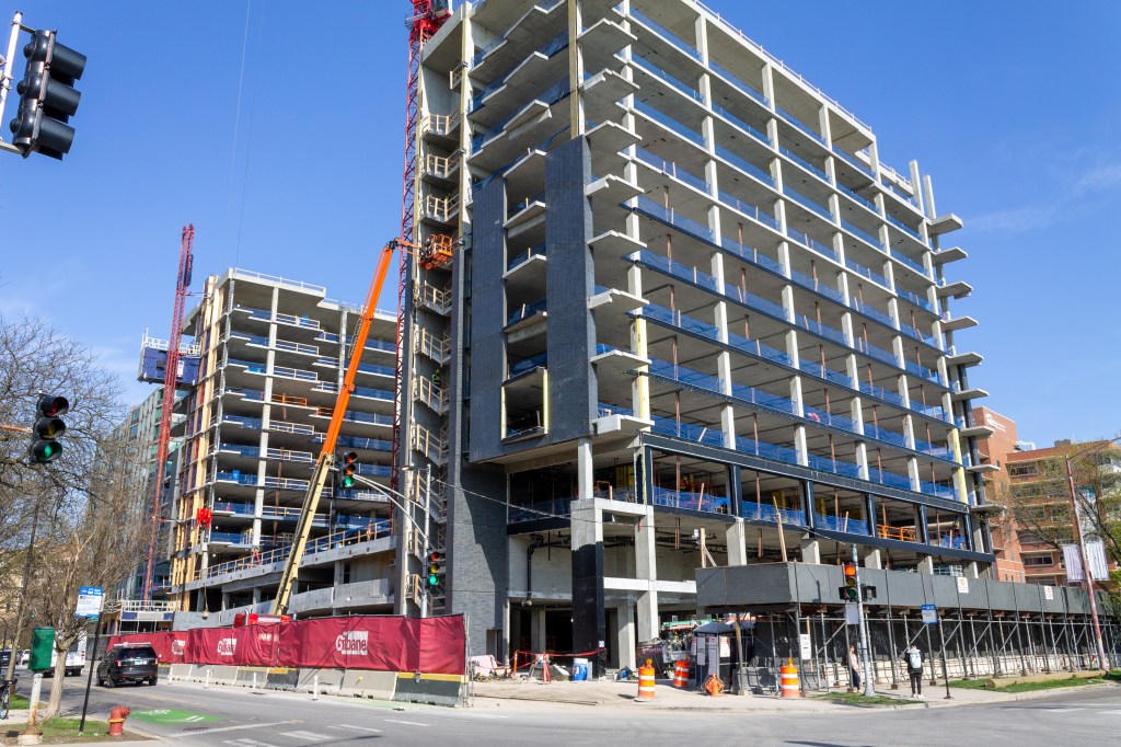 The closest tower crane to the B.U.C. HQ is still dong yeoman’s work at 4600 North Marine, the fully-grown 303-unit apartment tower in Uptown.