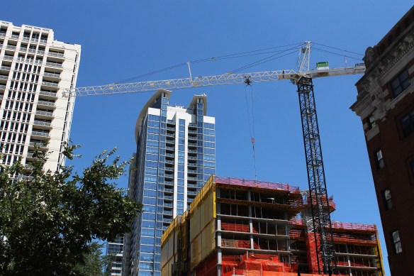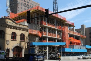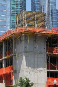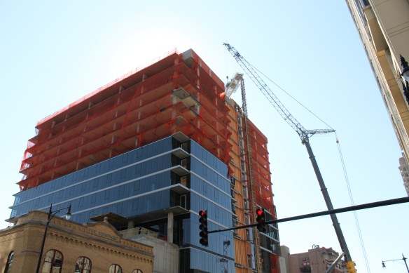 Save for a few exceptions, where construction hoists get in the way, the curtain wall has risen to the top of the 15-story 1407 On Michigan, Russland Capital Group’s South Loop apartment tower at 1411 South Michigan Avenue.