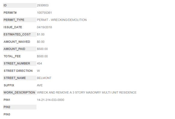 - The 454 West Belmont demo permit, issued April 19.