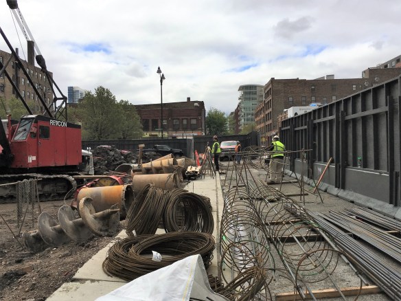A foundation permit was issued in December of 2016, but still, no action. Finally, in March of this year, the soil at 854 West Randolph began to turn. The earth-moving machines were followed by a pile driver, which began driving sheeting into the ground for a foundation. Caisson equipment arrived again, but for real this time, in May, and foundation work was underway in earnest. Finally, Centaur Construction had control of the site, and work started to go vertical.