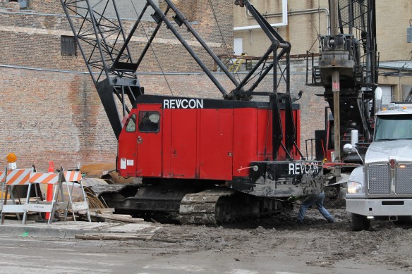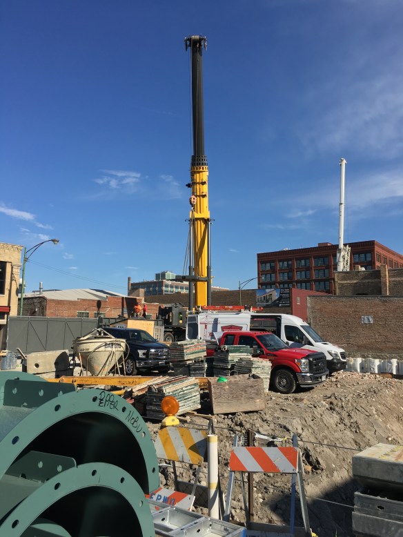 This time I’m certain. A caisson rig used for drilling caissons is drilling caissons at the Nobu Hotel site in the West Loop. It’s not a “quad sheet press,” like the one I misidentified back in March. Nope, this is for real. There’s a big red Revcon rig, digging holes. Plus, there are all those augers and, you know, caisson equipment.