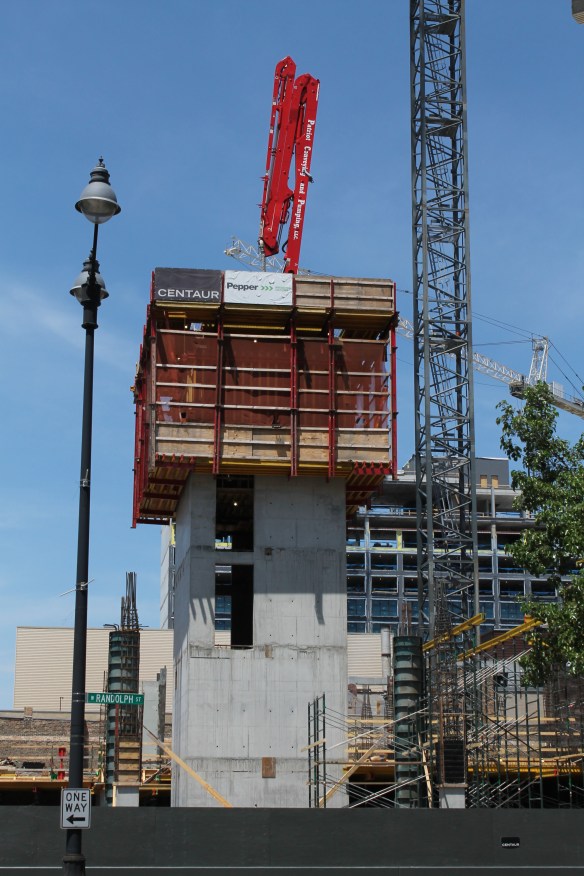 With Pepper Construction’s help on concrete, progress on the hotel has jumped up to the fourth floor since we last stopped by just a couple weeks ago, while the core continues to grow toward its 11-story goal.
