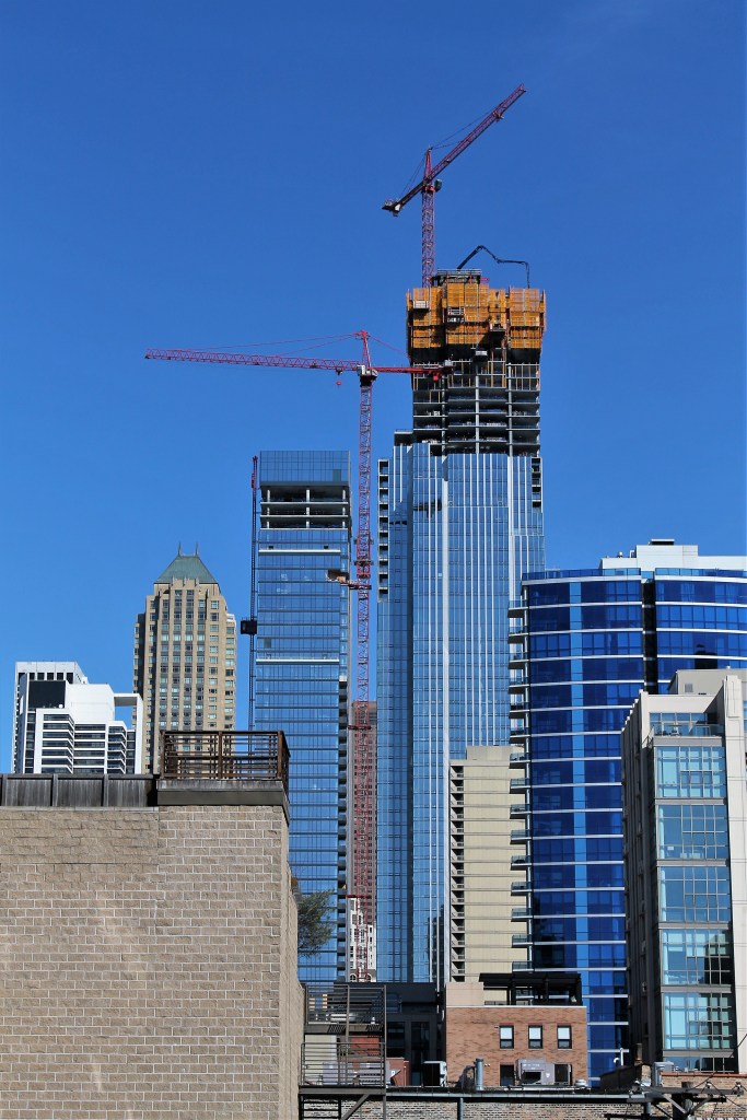 One Chicago Square has it all right now. Construction has started going vertical above street level, but there’s also still a giant pit. There are yellow and orange wooden forms and beams, with blue fencing all around. Classic Chicago architecture, including Holy Name Cathedral and 30 West Chicago Avenue, provides spectacular photo backdrops. Giant round shoring tubes are still visible in the northwest corner. Excavating equipment is still on site. Oh yeah, and THERE ARE THREE TOWER CRANES!